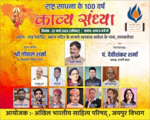 The Jaipur division of Akhil Bharatiya Sahitya Parishad is set to organize a grand Kavya Sandhya to commemorate 100 years of Rashtra Sadhna. This prestigious Samaroh will be held on March 22, 2026 (Sunday) at Pankh Restaurant, Mansarovar, Jaipur. The event features a stellar lineup of poets, including the renowned Vineet Chauhan (Alwar), Dr. Praveen Arya (New Delhi), and Dr. Nusrat Mehdi (Bhopal). The gathering will be graced by Chief Guest Shri Gopal Sharma (MLA, Civil Lines) and presided over by Pt. Devi Shankar Sharma. Other featured poets include Saurabh Surya, Dr. Vinamra Sen Singh, Praveen Shriram Deshmukh, Vikas Tiwari “Prajey”, Krishnarjun Pathbhakti, Surendra Singh Rao “Mrityunjay”, Rajendra Gaur, Navneet Gaur, Brijmohan Toofan, and Monika Gaur. The program begins at 6:00 PM.