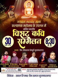 On the holy occasion of Bhagwan Mahavir Janm Kalyanak Mahotsav, a grand Akhil Bharatiya Virat Kavi Sammelan Muzaffarnagar has been scheduled for March 30, 2026. The event will commence at 8:30 P.M. at the Jain Aushdhalaya, Prempuri, Muzaffarnagar. This cultural Samaroh aims to celebrate the teachings of Lord Mahavir through the powerful medium of poetry. The stage will be graced by a stellar lineup of renowned poets from across the country. Prominent names include Shri Swayam Srivastava from Unnao and Shri Gaurav Chauhan (specialist in Veer Hasya Ras) from Etawa. Joining them are B. Kushal Kushvendra from Delhi, Dr. Anshul Aradhyam (Geetkar) from Indore, Dr. Shubham Tyagi (Sabras), and Shri Vinod Pal (Hasya Kavi) from Delhi. The event is organized by the Samast Prabandh Karayakarini, Shri Shantinath Digambar Jain Panchayati Mandir, Prachin Bada Mandir Parasnath Street, Abupura, Muzaffarnagar. The entire Sakal Digamber Jain Samaj Muzaffarnagar serves as the Nivedak for this prestigious gathering. Highlights of the program will also be featured
