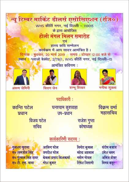 The New Timber Market Dealers Association (Regd.), based in WHS Kirti Nagar, New Delhi, successfully organized a grand Holi Mangal Milan Samaroh and Hasya Kavi Sammelan. This festive Samaroh brought together the local business community to celebrate the spirit of Holi through literature and laughter. The event featured a stellar lineup of guest poets, including the renowned Arun Gemini and the energetic Shambhu Shikhar, who entertained the audience with their satirical brilliance.