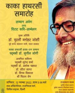 The prestigious Kaka Hathrasi Samaroh Evam Virat Kavi Sammelan in Delhi was organized by the Rajasthan Club on Saturday, November 12, 2022. This grand Samaroh, which commenced at 5:00 PM at the Shah Auditorium, Rajniwas Marg, Civil Lines, Delhi, featured the presentation of the Kaka Hathrasi Hasya-Ratna Samman to Padma Shri Dr. Sunil Jogi. The event showcased an elite gathering of invited poets, headlined by the legendary Padma Shri Surendra Sharma and Padma Shri Dr. Ashok Chakradhar. Other esteemed participants included Dr. Sita Sagar, Dr. Vinay Vishwas, and Shri Chirag Jain. The program was graced by Chief Guest Dr. Murli Manohar Joshi, former Union Minister for Human Resource Development. The leadership of the Rajasthan Club, including President Sunil Goyal, Former President Mukesh Agrawal, General Secretary Bharat Agrawal, and Vice President Pramod