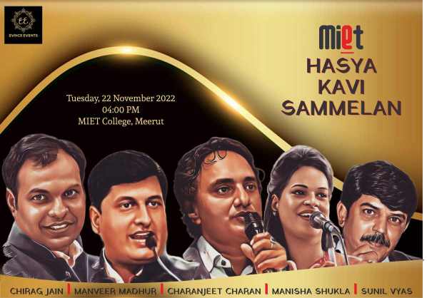 The MIET Hasya Kavi Sammelan in Meerut was a high-spirited literary event organized at the MIET College campus. This vibrant Samaroh took place on Tuesday, November 22, 2022, starting at 04:00 PM. The event was curated by Evince Events and featured a stellar lineup of invited poets, including the popular Chirag Jain, Manveer Madhur, Charanjeet Charan, Manisha Shukla, and Sunil Vyas. The gathering brought together students and poetry lovers for an evening of satire and wit, marking a significant cultural moment at MIET College.