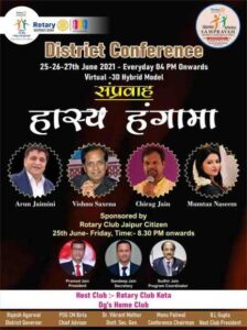 Rotary District 3054 recently organized a vibrant Hasya Hungama as part of its District Conference, titled Sampravah. This unique event was held in a Virtual – 3D Hybrid Model from June 25th to 27th, 2021. The Kavi Sammelan session, which took place on Friday, 25th June, was sponsored by the Rotary Club Jaipur Citizen and began at 8:30 PM onwards. The gathering served as a significant cultural highlight of the conference, bringing together members from across the district.