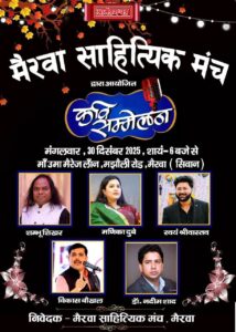 This prestigious Kavi Sammelan features an elite lineup of poets, including the widely celebrated Shambhu Shikhar and the talented Manika Dubey. They will be joined by noted poets Swayam Srivastava, Vikas Baukhal, and Dr. Nadeem Shad, ensuring a diverse range of poetic expressions. The Mairwa Sahityik Manch serves as the primary Nivedak (petitioner) and organizer for this significant cultural gathering.