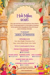 The evening’s highlight will be a Hasya Kavi Sammelan featuring the esteemed Padama Shri Surendra Sharma. Guests will also be treated to traditional Dilli Ki Chaat and a cocktail dinner. This private gathering is presented with compliments from a distinguished group including Chunnu Jindal, Rajendra Gupta, Anil K Agarwal, Ramesh Yadav (IRS, Retd.), and Surinder P. Gupta (Sassoon). Please note that this is a non-transferable invitation and must be carried for security reasons.