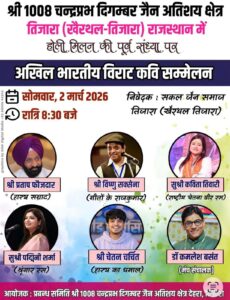 The evening will feature a stellar lineup of invited poets, including the Hasya Samrat Shri Pratap Faujdar and the renowned voice of Rashtriya Chetna Veer Ras, Sushri Kavita Tiwari. Joining them are Shri Vishnu Saxena, known as the Geeton ke Rajkumar, Sushri Padmini Sharma specializing in Shringar Ras, and Shri Chetan Charchit for Hasya ka Dhamal. The vital role of Munch Sanchalan will be performed by Dr. Kamlesh Basant. The Prabandh Samiti of Shri 1008 Chandraprabhu Digambar Jain Atishay Kshetra Dehra, Tijara, invites all to witness this cultural extravaganza.
