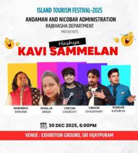 As part of the prestigious Island Tourism Festival-2025, a grand Hasya Kavi Sammelan is set to take place in Sri Vijaypuram. This cultural Samaroh is presented by the Rajbhasha Department of the Andaman and Nicobar Administration. The event will feature a stellar lineup of poets, headlined by the renowned Shambhu Shikhar and Shailja Singh, who are expected to enthrall the audience with their wit and satire.