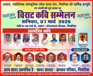 The Anhad Sahityik Sanskritik Lok Kala Manch is organizing a grand Virat Kavi Sammelan Pipariya on the eve of Rang Panchami. The Samaroh is scheduled for Saturday, March 7, 2026, starting at 9:30 PM at the Mangalwara Chauraha, Pipariya. This annual presentation promises a night of cultural and literary brilliance.